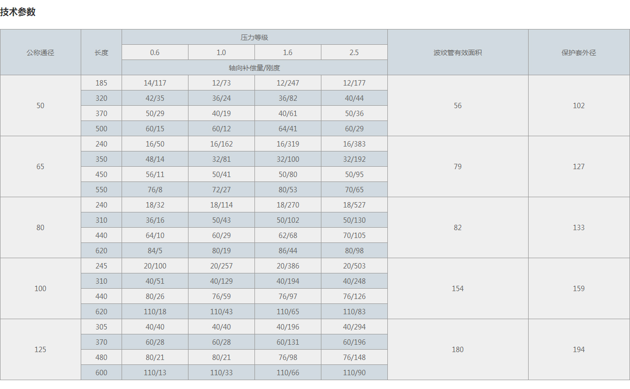 公稱通徑 | 長(zhǎng)度 | 壓力等級(jí) | 波紋管有效面積 | 保護(hù)套外徑 | |||